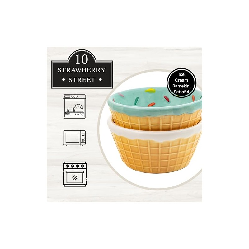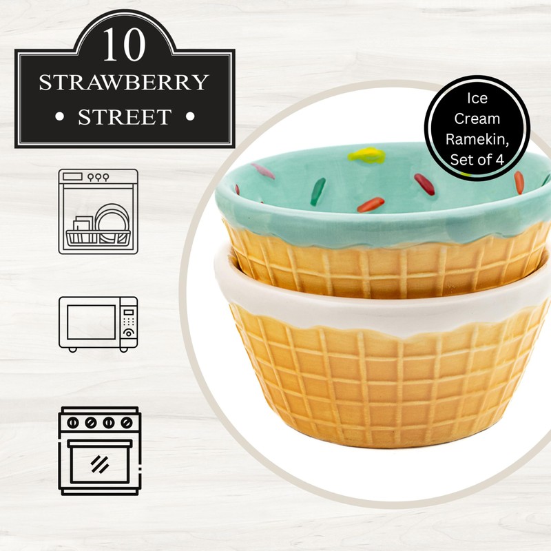- Design: Waffle cone-shaped bowls, two mint with sprinkles, two white with sprinkles