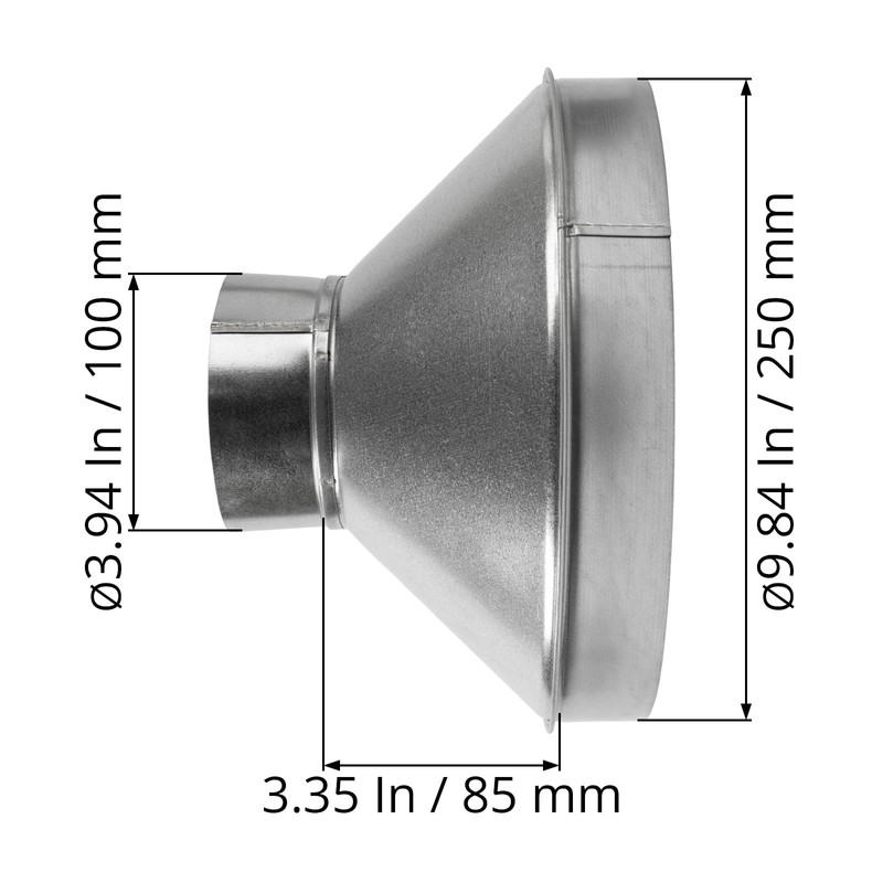 - Round Ducting Adapter: Converts 10" (9.84") to 4" (3.93") / 250mm Male to 100mm Male Sizes