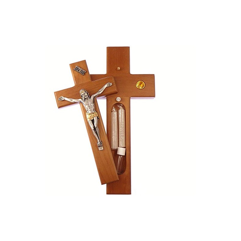 - The crucifix is also a box and inside it has water bottle (empty bottle to fill yourself) and 2 candles