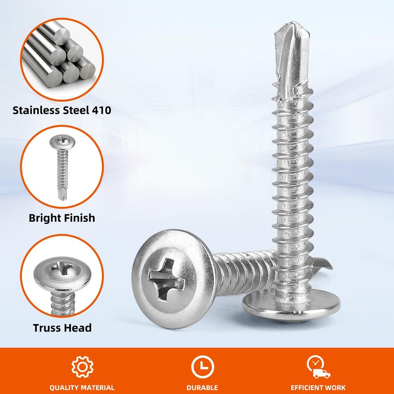#10 x 1-1/2" (1/2" to 1-1/2" Available) Wafer Head Self Drilling Sheet Metal Screws, Stainless Steel 410, Modified Truss Head Self Driller, 50 PCS