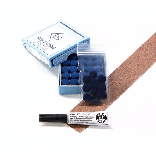 10 X 10mm Leather Blue Diamond Snooker Pool Cue Tips - FREE C&C Cue Tip Gel Glue