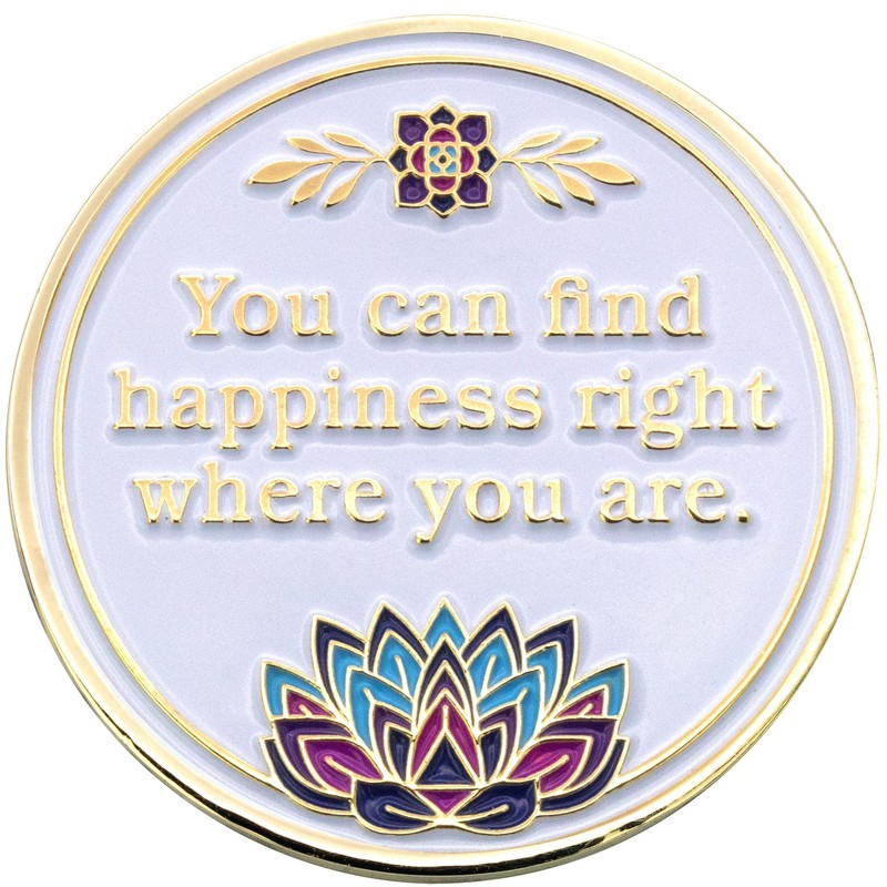 - {Back Features} - Quote - "You can find happiness right where you are." | Additional full-color small Lotus design beneath the inspirational quote