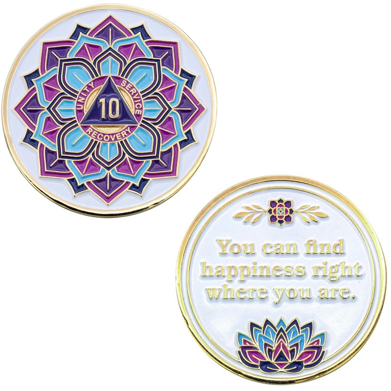 10 Year AA Coin - Sobriety Mint 'in Bloom' Lotus Flower Recovery Medallion/Chip - White/Gold