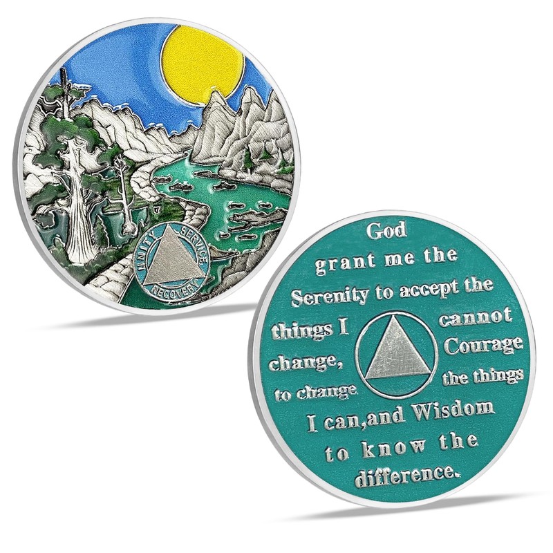 • Scenic Sun Mountain River Design: Adorned with a breathtaking scene of a radiant sun casting its warm glow over majestic mountains and a serene river, this coin captures the beauty of nature and the tranquility of sobriety. Its captivating design serves as a daily reminder of the journey towards inner peace.