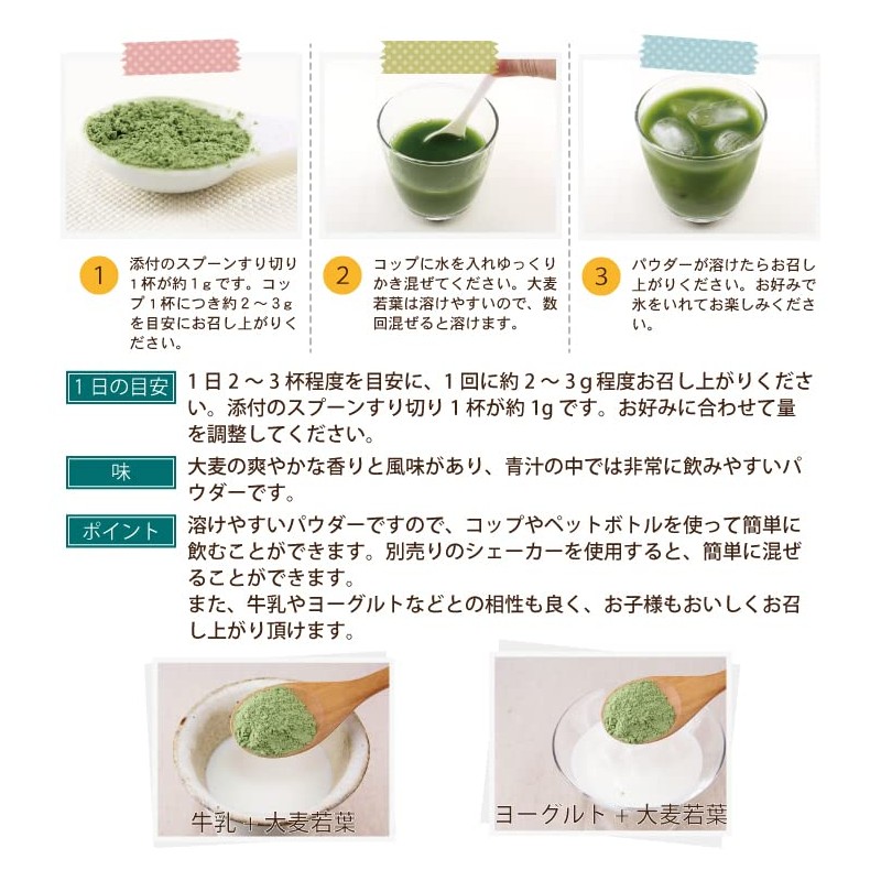 - 【飲み方】ティースプーンすり切り1杯(約2g)を1回分とし、少量の水やお湯を入れてよく溶いてください。 パウダーが溶けたら、水やお湯を注ぎお召し上がりください。1日に2~3回を目安にお召し上がりください。時間が経つと底にパウダーがたまってきますので、かき混ぜながらお召し上がりください。