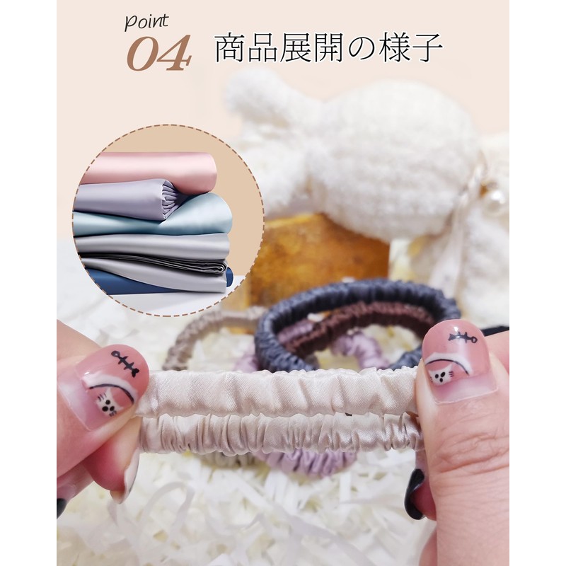 • 【毎日髪にやさしいヘアゴム】普通のヘアゴムで髪をまとめると、髪が絡まってしまって、それを無理やり取ってしまうと切れ毛の原因になります。 本製品は100%シルク製なので、外すときの摩擦も少なく、髪の負担を最小限におさえ、髪にやさしいです。