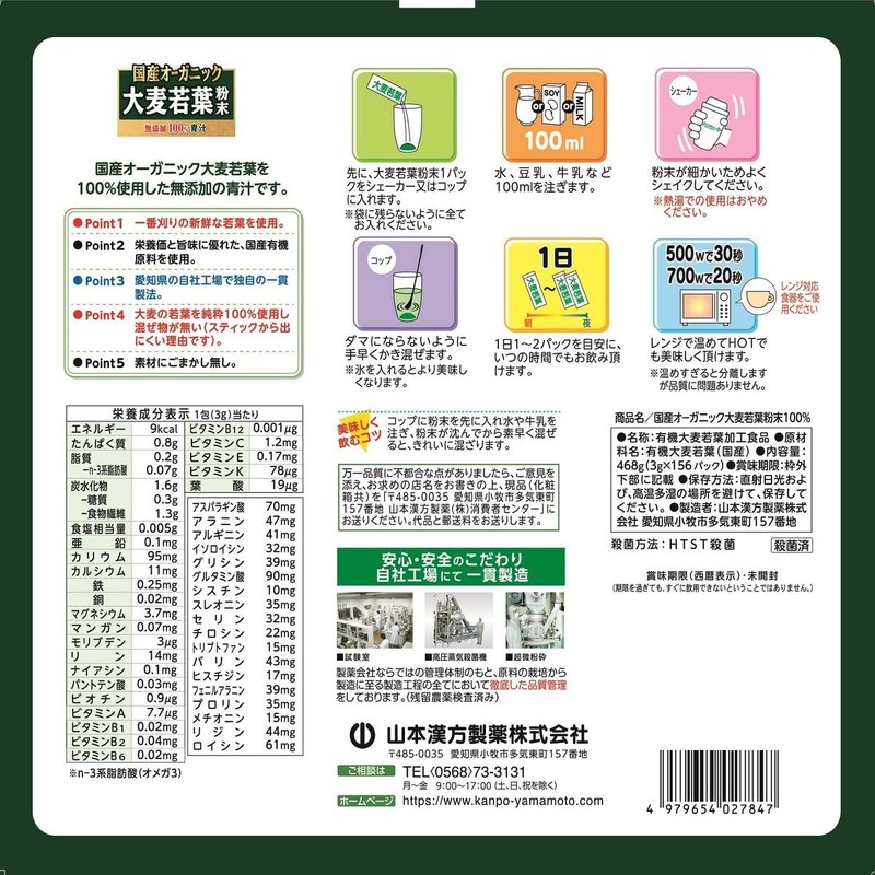 【販路限定品】山本漢方製薬 国産オーガニック 大麦若葉無添加100% 3g×156包