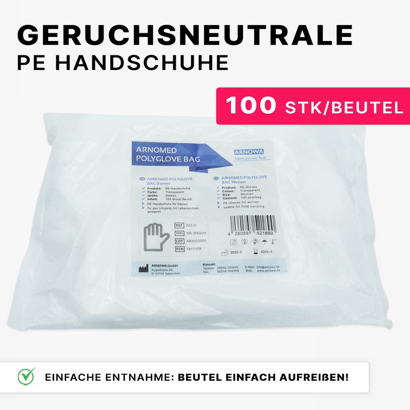 - ARNOMED Disposable polyethylene gloves for men ✓ Pack of 100 transparent polyethylene disposable gloves in a bag. The one size fits all for men fits any hand size and thus allows reliable hygienic use.
