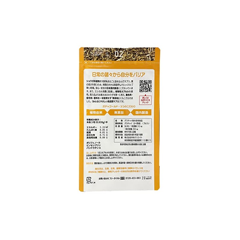 • 【 原材料 】 グラチャイ<タイ原産>/プルラン (プルランは、遺伝子組換えでないトウモロコシからできた植物性カプセルに使用) ※着色料無添加・香料無添加・保存料無添加