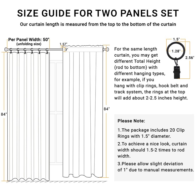 - Packaging Includes : Blackout curtains for bedroom 84 inches long have 2 Panels per package, and each panel has 10 Clip Rings with 1.2" diameter.