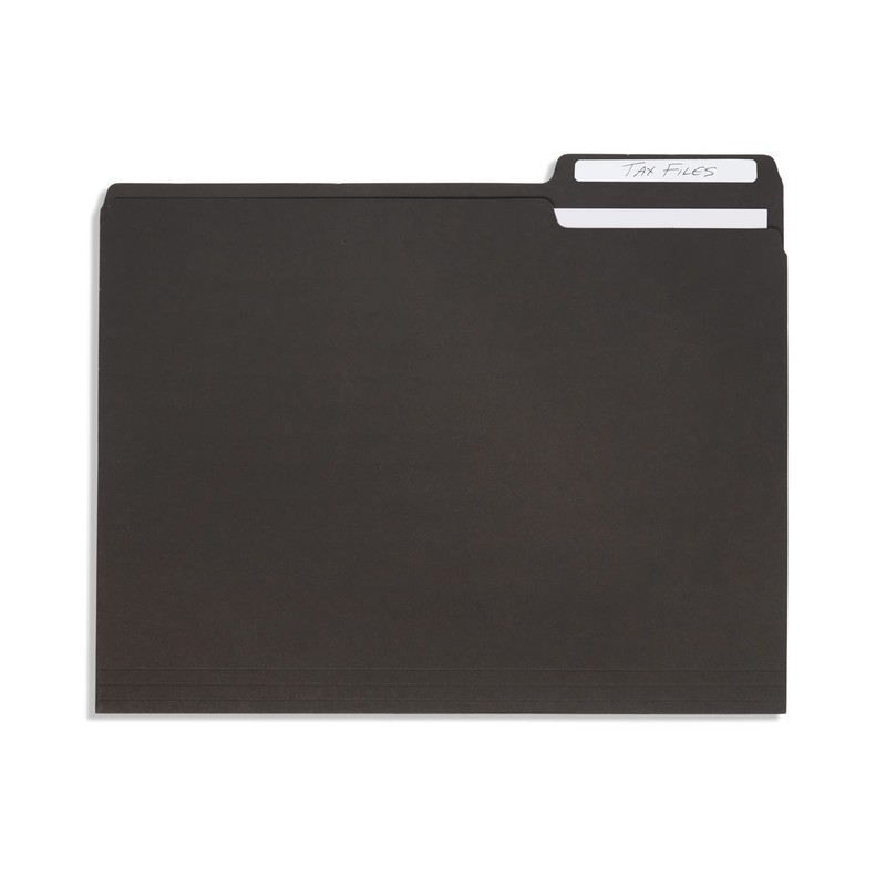 - Make use of adhesive labels on the 1/3 cut tabs in assorted positions (left, right, and center) to organize your black folders and easily identify your documents at a glance.