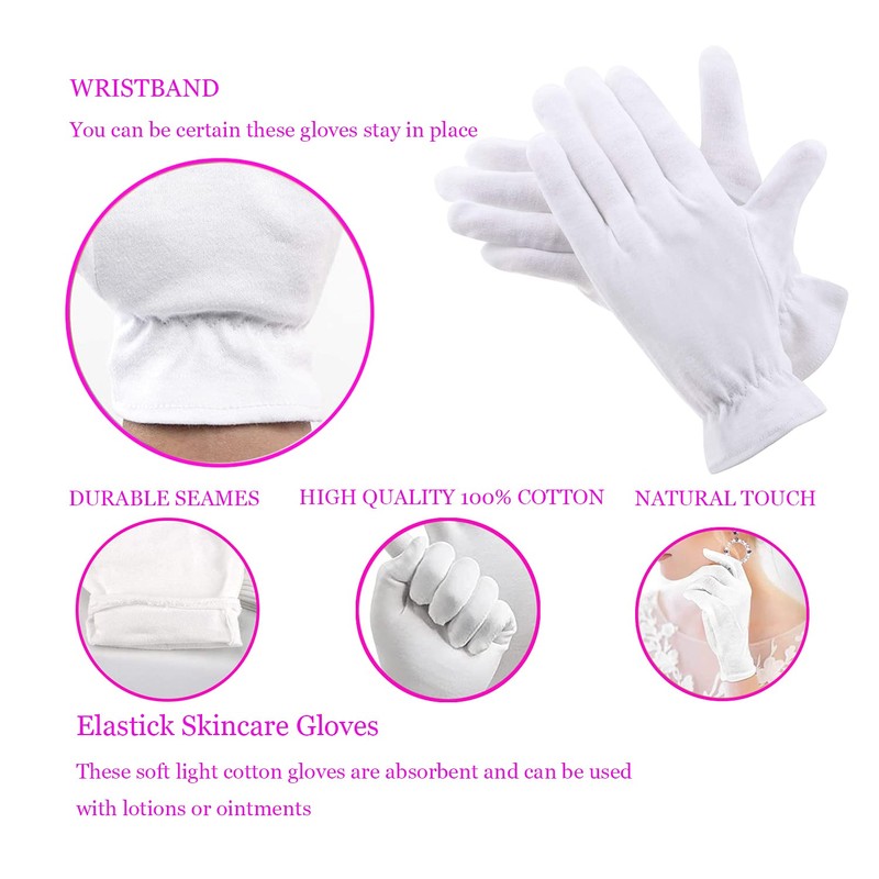 - 【WIDE APPLICATION】 - These white skincare gloves can be worn to moisturize your hands. They can also be used as coin gloves, archive gloves, work gloves, linen gloves, lotion gloves, cloth gloves, inspection gloves, costume gloves, serving gloves, sleeping gloves or glove liners etc.