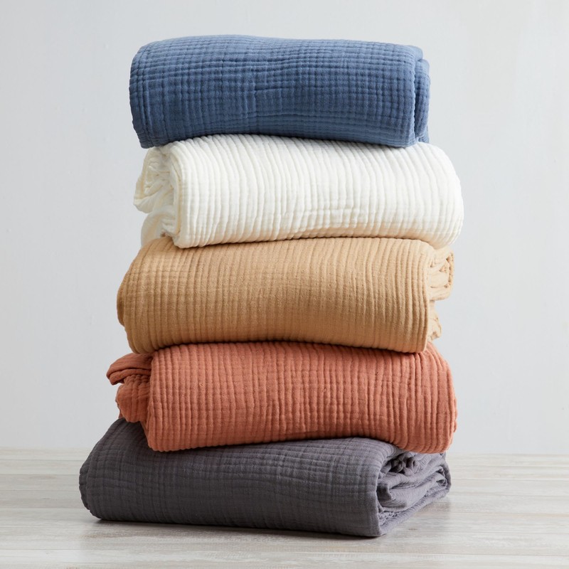 Add casual comfort with a modern flair to your home with this beautiful Maria Collection 100% Cotton Muslin Bed Blanket by Market & Place. Crafted with a soft and breathable 100% cotton muslin material, this blanket offers a beautiful accent to any room year-round. Place on your favorite sofa or as a stylish layering piece over your bed! This blanket is machine washable for easy care and long lasting use. Choose from three sizes: Twin (66"W x 90"L), Full/Queen (90" W x 90" L); King (102" W x 90" L) and five colors: Off-White, Beige, Rust, Charcoal, and Blue.