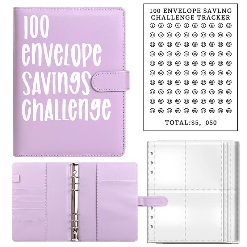 This 100 Envelope Saving Challenge binder includes a 1Pcs A5 Pu leather binder, 1 Pcs sheet tracker with a range of $1 to $100, and 25 6-hole cash envelopes printed with numbers 1-100. These tools work together to effectively organize your budget.