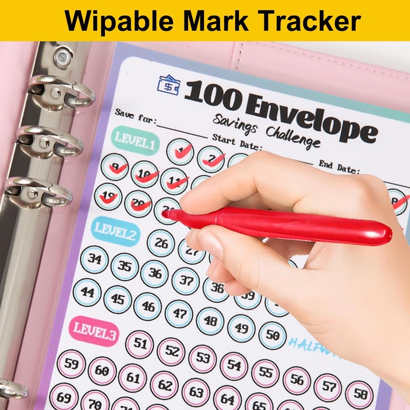 - 【100 Envelopes Money Saving Challenge Kit】This set comes with 1pc A5 binder, 25pcs 6-hole cash envelopes printed number with 1-100, 3 different sheet challenge tracker.