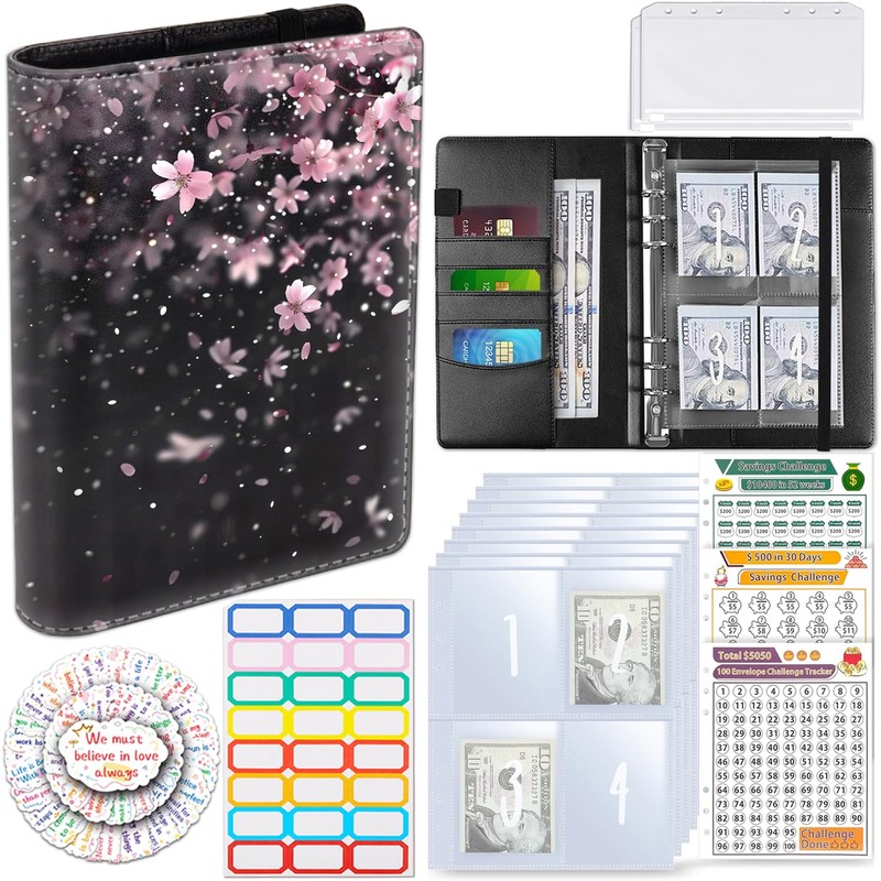 - You Will Receive: 1pc A5 leather binder, 3 different style challenge trackers and 25pcs 6-hole cash envelopes pre-printed with 1-100, Money Saving Binder will help you build an emergency savings fund and manage your finances effectively. 2 PVC coin zipper pouches, 1 colorful sticky note, 20 inspirational quote stickers! Also it's a great tool for teaching children the habit of saving.