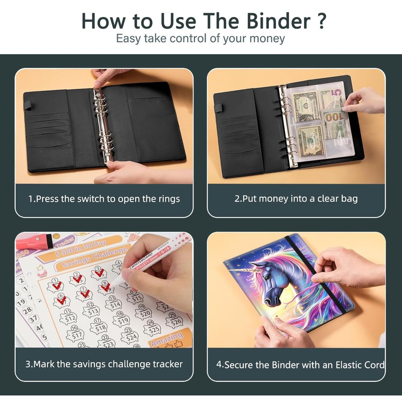 - You Will Receive: 1pc A5 leather binder, 3 different style challenge trackers and 25pcs 6-hole cash envelopes pre-printed with 1-100, Money Saving Binder will help you build an emergency savings fund and manage your finances effectively. 2 PVC coin zipper pouches, 1 colorful sticky note, 20 inspirational quote stickers! Also it's a great tool for teaching children the habit of saving.