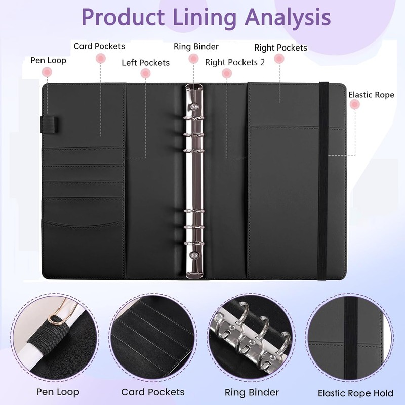 - đ°ăMultifunctional Budget BinderăIn addition to cash, this binder also holds business cards, credit cards, pens, bills, receipts and notes. The padded PU leather binder and premium PVC cash envelopes are waterproof, tear-proof and scratch-proof, protecting your belongings from water and dust. Carry it with you and stay organized, say goodbye to other complicated money storage jars.