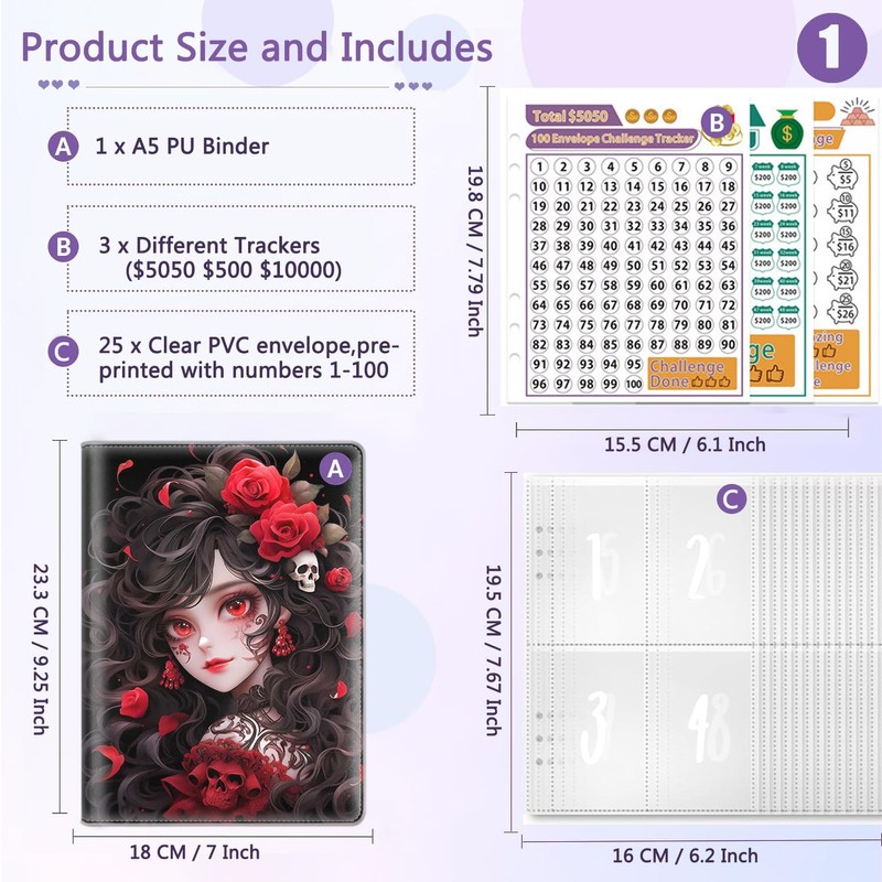 - 💰【100 Envelopes Challenge Kit】 1x PU leather savings challenges book with card slot, cash wallet, 3x laminated reusable savings tracker for marking - $5050, 10000, 500, 25x pages 6-hole cash envelope (4 pockets per page) with pre-printed 1-100 numbers, 2x PVC zipper bags, 1x Colorful Label Stickers, 20x Inspirational Quotes Stickers.