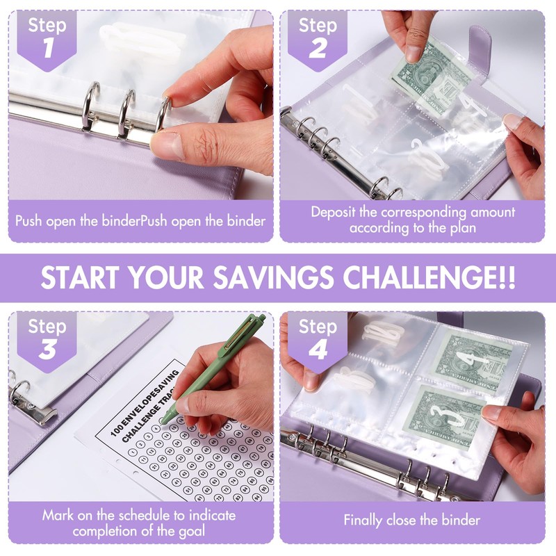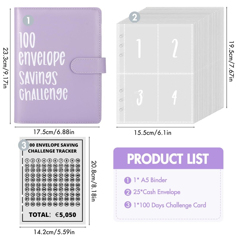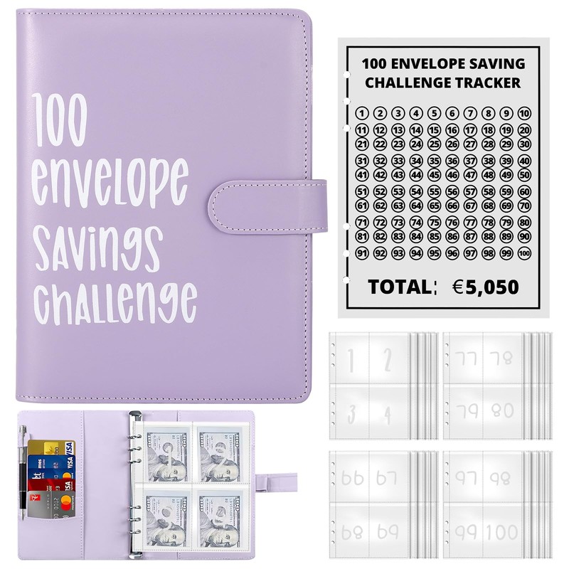 - MONEY SAVING CHALLENGE BINDER: You will receive an A5 money saving folder budget, 25 pages with 100 envelopes to save, 1-100 number stickers, you can customize and develop a savings program that works individually for you. With the savings challenge folder with 100 envelopes, you can have more fun with your savings challenge. When you have completed the 100-day savings challenge, you save 5050 euros. You can manage your planner and your savings more efficiently