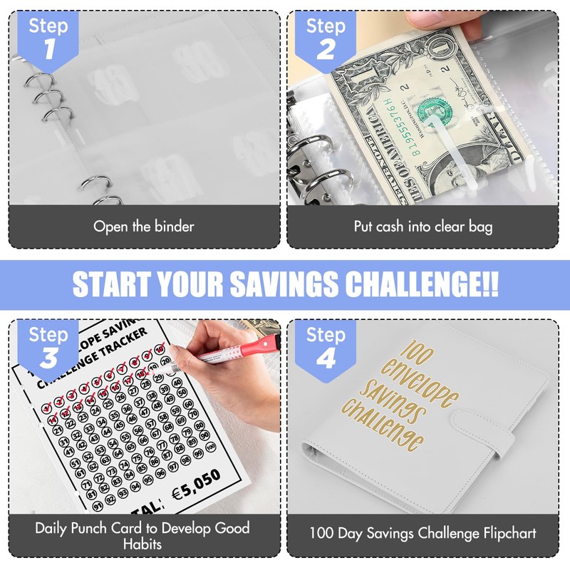 - MONEY SAVING CHALLENGE BINDER: You will receive an A5 money saving folder budget, 25 pages with 100 envelopes to save, 1-100 number stickers, you can customize and develop a savings program that works individually for you. With the savings challenge folder with 100 envelopes, you can have more fun with your savings challenge. When you have completed the 100-day savings challenge, you save 5050 euros. You can manage your planner and your savings more efficiently