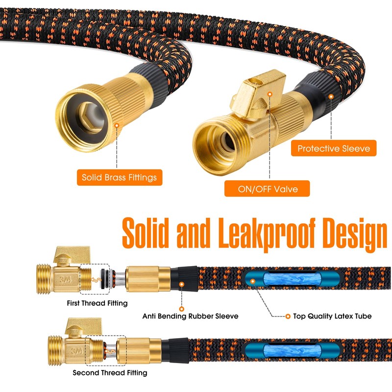 - SOLID & LEAKPROOF BRASS CONNECTORS - Equipped with solid brass connectors, leak-proof rubber washers and anti-bending rubber protectors, well sealed by aluminium buckle, the collapsible hose fittings are crack resistant, corrosion-proof and leak resistant, therefore much more durable than old plastic fittings. They are compatible with typical garden faucets, spray nozzles, sprinklers. And there is an easy to use copper shutoff valve on the male fitting side to help you turn on/off water fast.