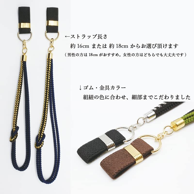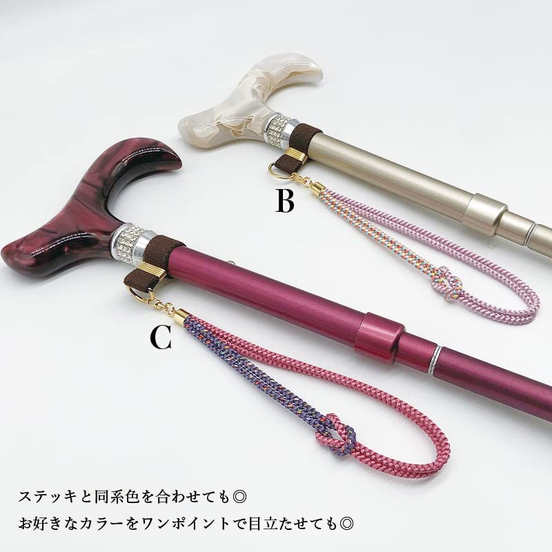- 【便利・安心・細かい気配り】 根元のゴム部分をステッキに通すだけの簡単仕様。 長さを16cm/18cmからお選び頂けます。(一部の色に限ります。男性のおすすめは18cm/女性はどちらでも大丈夫です) 組紐の色に合わせ、ゴムや金具の色…細部までこだわりました。トータルのおしゃれをお楽しみください。
