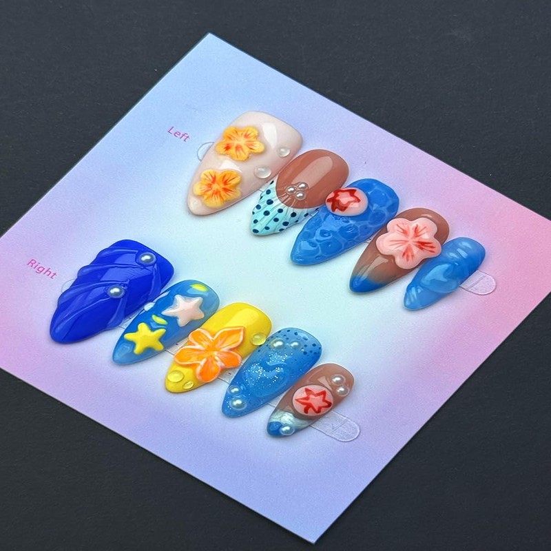 100% Handmade Press on Nails Medium Almond Handmade Nails with Yellow Flower Design Blue False Nails Glossy Pearl Rhinestones Nail Press ons Reusable Acrylic Fake Nails for Women Girls Size L 10Pcs