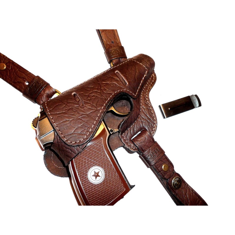 - Shoulder gun holster. Genuine leather. Horizontal or vertical position carry. Adjustable shoulder straps.