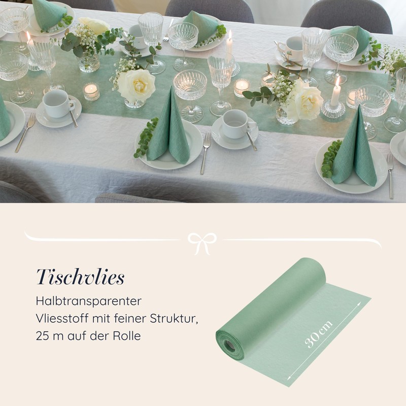 - Box contents: 1 x non-woven table runner roll (30 cm x 25 m), 40 napkins (33 x 33 cm) in eucalyptus green and white by 100%Mosel