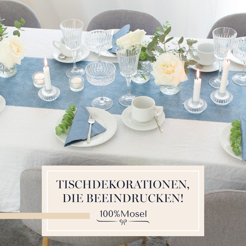 100%Mosel Table Decoration Set Smoke Blue - 20-40 Guests - Table Runner & Napkins for Christening, Communion, Confirmation, Wedding & Birthday - Practical Decoration Set for Special Occasions