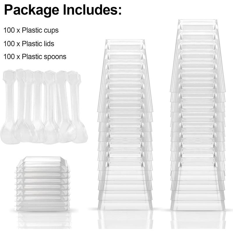100 Pack 5oz Dessert Cups with Lids & Spoons Reusable Square Plastic Parfait Cups for Mousse Tiramisu Pudding Salads, Appetizers & Desserts Disposable - Quantity per pack: Pack of 100