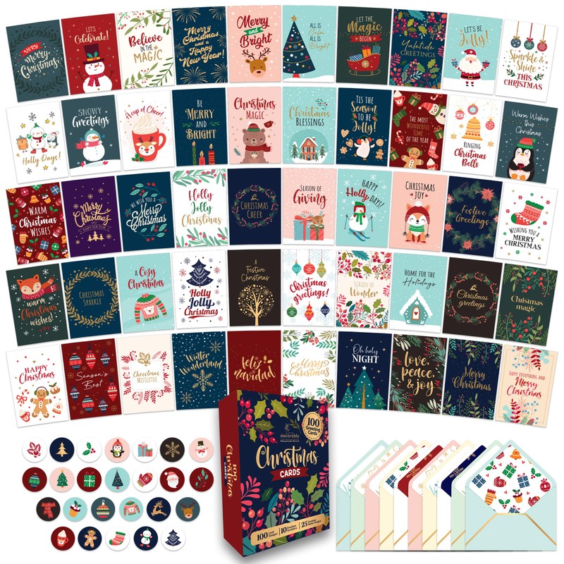 - COMPLETE PACKAGE - Mix & match the 100 christmas cards with envelopes & stickers. It includes 100 unique holiday card designs, 100 envelopes in 10 designs with pre-water soluble gum closure and printed lining & 120 matching stickers in 25 designs.
