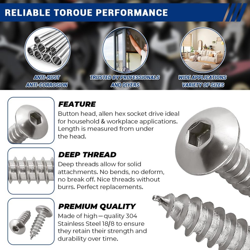Crafted from 304 stainless steel (18-8 grade), these socket cap sheet metal tek screws deliver exceptional rust and corrosion resistance, making them ideal for outdoor projects, marine environments, or humid conditions. Their self-tapping design effortlessly penetrates metal, wood, and plastic without splitting or stripping, while the polished finish ensures a clean, professional look. Built to withstand harsh elements, these screws offer long-term durability for both indoor and outdoor applications