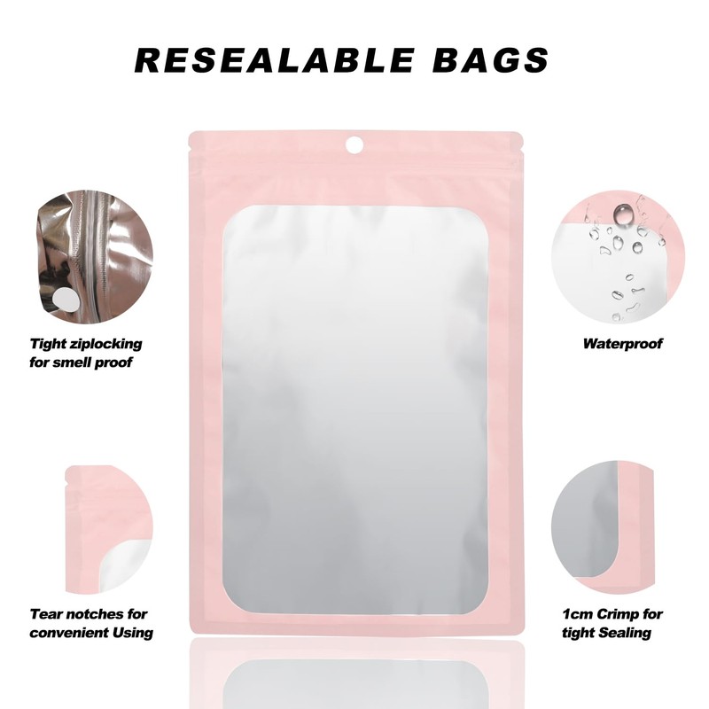 100 Pack Mylar Bags with Clear Window,Food Storage Smell Proof Bags,Scratch Resistant Hand Packaging,Resealable Bags for Small Bussiness Cookies Candy Sample (Pink, 6.31 * 9.45 inch)