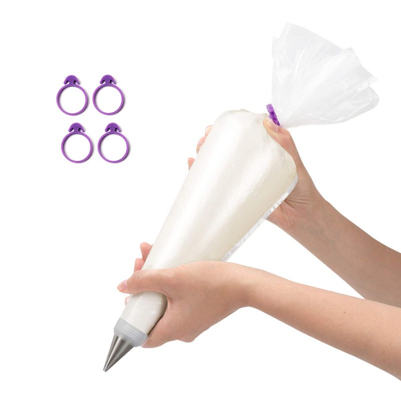 - 4 Reusable Bag Ties - 4 icing bag ties to use. Those bag ties hold the bag closed without icing leaking when frosting or just stop pastry work.