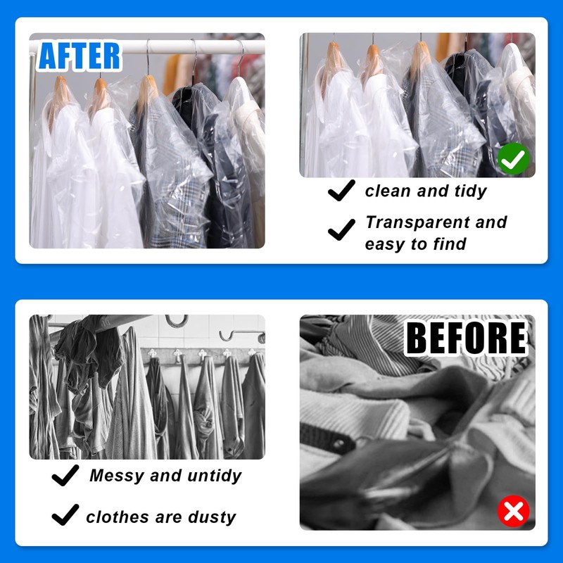 - Enhanced Clothing Protection: Safeguard your wardrobe from dust, moisture, and wrinkles with our set of 100 clear covers for clothes. Keep your favorite outfits in pristine condition.