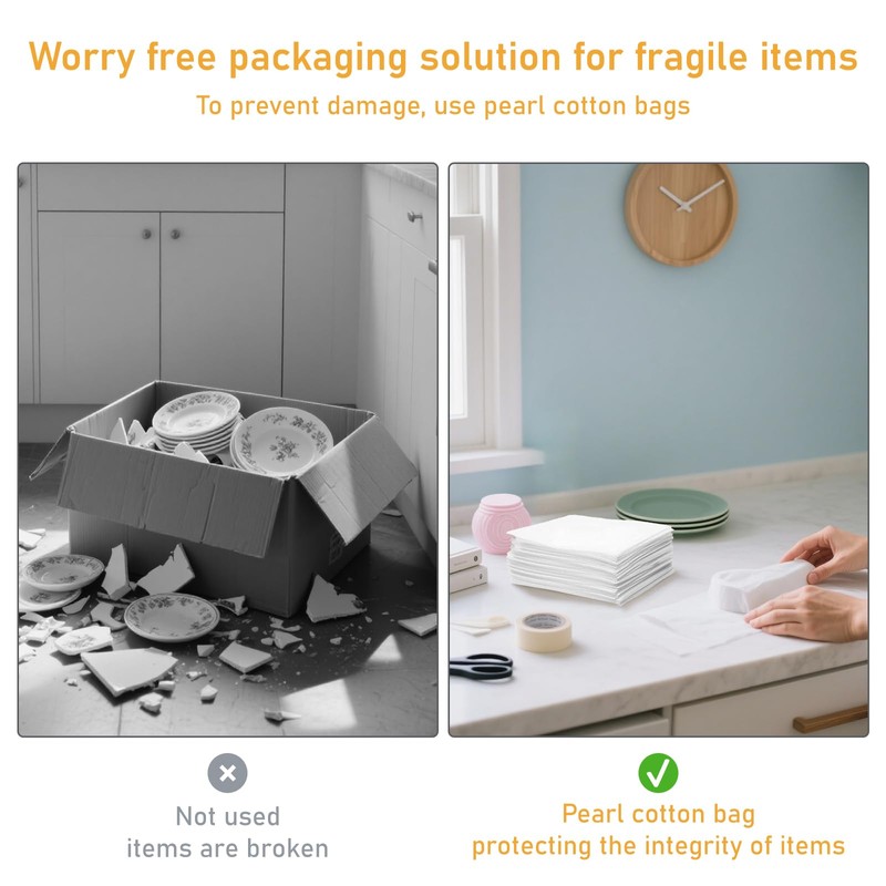 - Multiple uses: Cushioning foam packaging bags perform well in storage, handling and transportation scenarios, and are ideal for packaging fragile products. Whether it is tableware such as plates, porcelain, glass, cups, or objects such as picture frames, furniture legs, corners, etc., reliable protection can be provided for them.