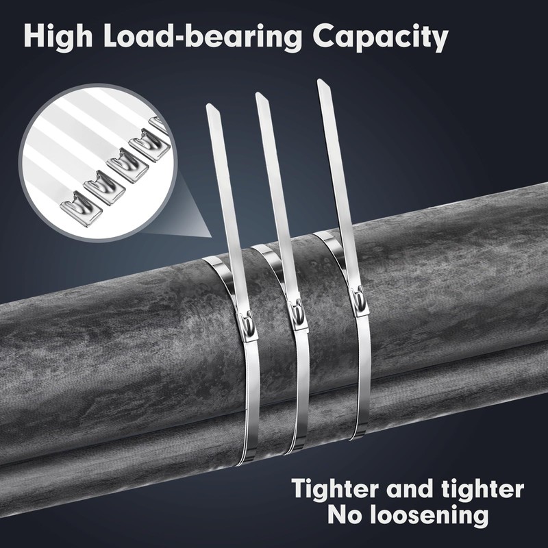 - [Set Contains] This set contains 100 pieces of 11.8 inch stainless steel zip ties each piece can withstand a weight of 220Pounds, high adaptability to heavy objects at the same time for you to the need for multiple sets of straps to bind the items to provide convenient.
