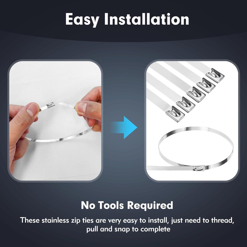 - [Quick Installation] Our stainless zip ties are more durable than normal metal material stainless zip ties and can be used in a wider range of scenarios, these stainless zip ties are very easy to install, just need to thread, pull and snap to complete, if carefully cut, can be reused.