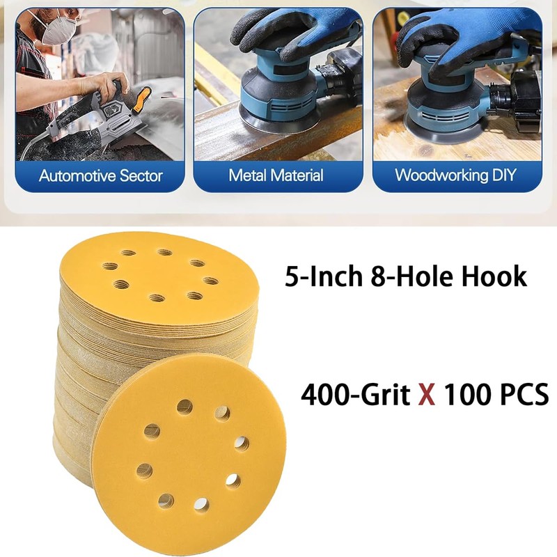 100 Pcs 5 Inch Sanding Discs Hook and Loop, 400 Grit 8 Hole Gold Premium Dustless Random Orbit Sandpaper for Woodworking or Automotive