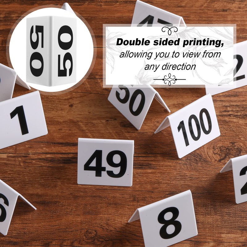 - Table Number Set: the package comes with 100 pieces of tent table numbers, enough to meet your daily needs, bold black numbers on white background, and the numbers printed on are from 1 to 100, they can stay standing on their own, no need glue and can easily be placed on tables