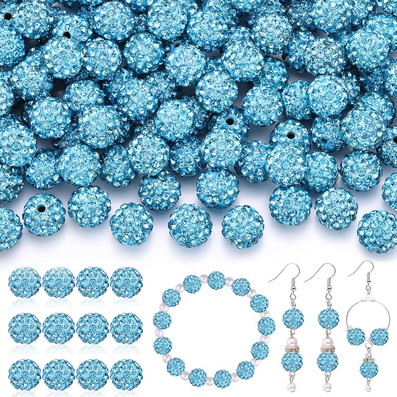 100 Pcs Aquamarine Rhinestone Beads for Jewelry Making, Sparkle Crystal Clay Christmas for Bracelet Baseball Necklace Earring Crafting and DIY, Shiny Round Shamballa Disco Ball Beads Bulk