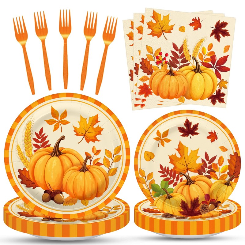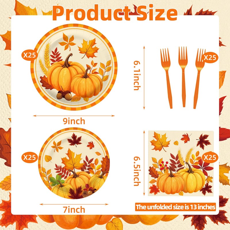 - PACK OF 100 | FALL PUMPKIN TABLEWARE SET FOR 25 GUESTS: Includes 25 x 9-inch dinner plates, 25 x 7-inch dessert plates, 25 napkins, and 25 orange plastic forks. Designed with pumpkins, fall leaves, and acorns, this matching set is perfect for Thanksgiving, Friendsgiving, and autumn-themed parties.