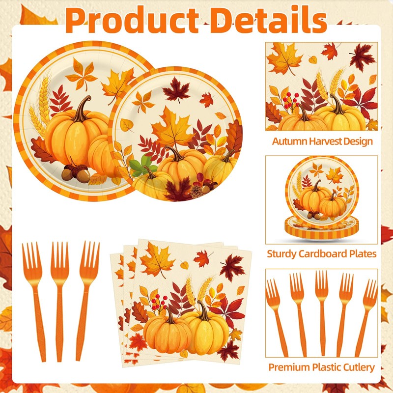 - FESTIVE PUMPKIN & LEAF DESIGN: With vibrant prints of pumpkins, colorful maple leaves, and harvest elements, this set adds a seasonal touch to your table. Ideal for cozy gatherings, fall birthdays, and harvest feasts.