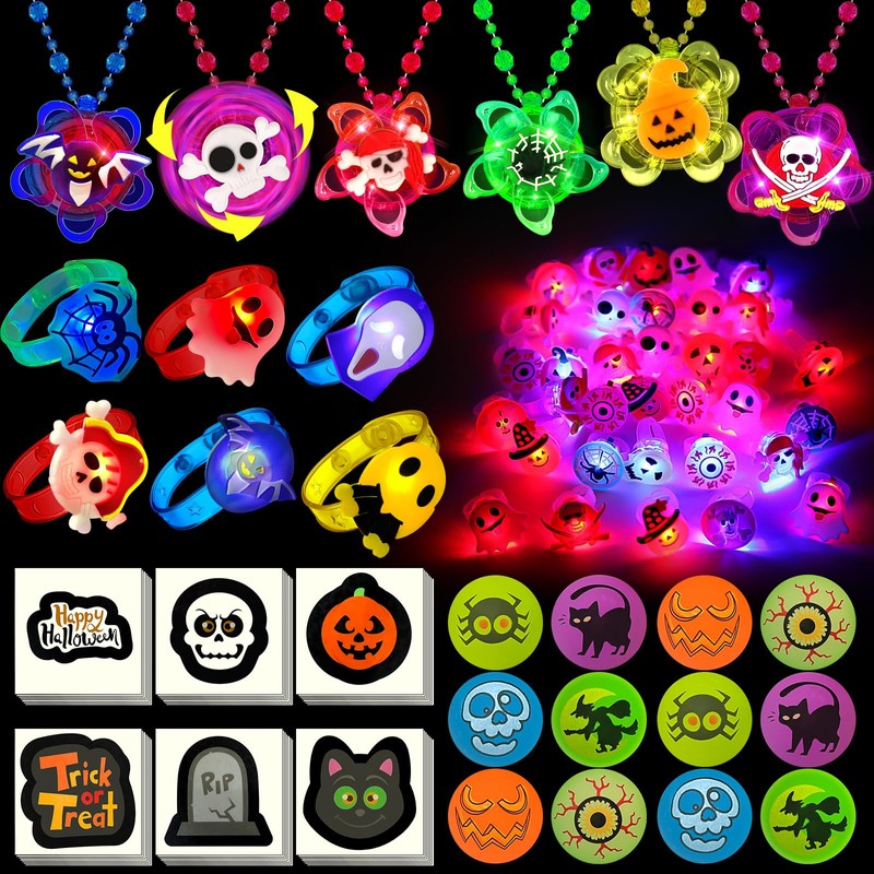 - [ Halloween Light Up Toys ] These light up Halloween toys are perfect. 6 LED Light Up Spinning Necklaces, 6 LED bracelets, 36 flash LED rings, 12 bouncy balls can glow at night, 40 Halloween temporary tattoos. totally in 100 pcs. The style may be a little different. Enough quantities and styles for family or friends gathering