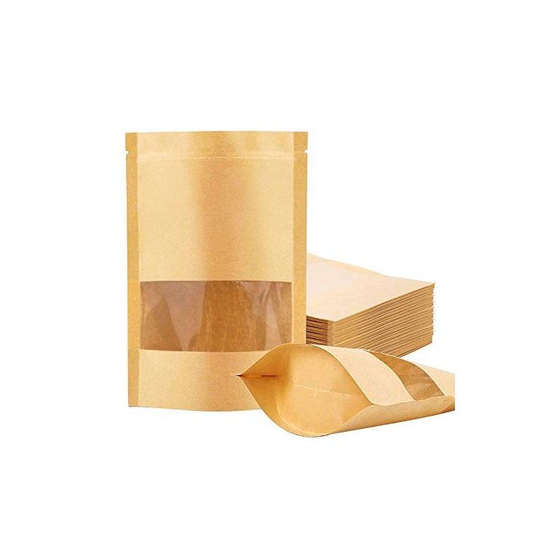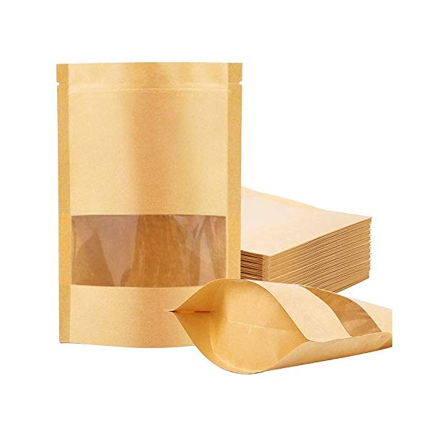 100 Pcs Kraft Paper Bags with Window, 3.9" x 5.9" Stand Up Pouches Bags, Zip Lock Food Storage Bags for Packaging Products, Reusable, Sealable