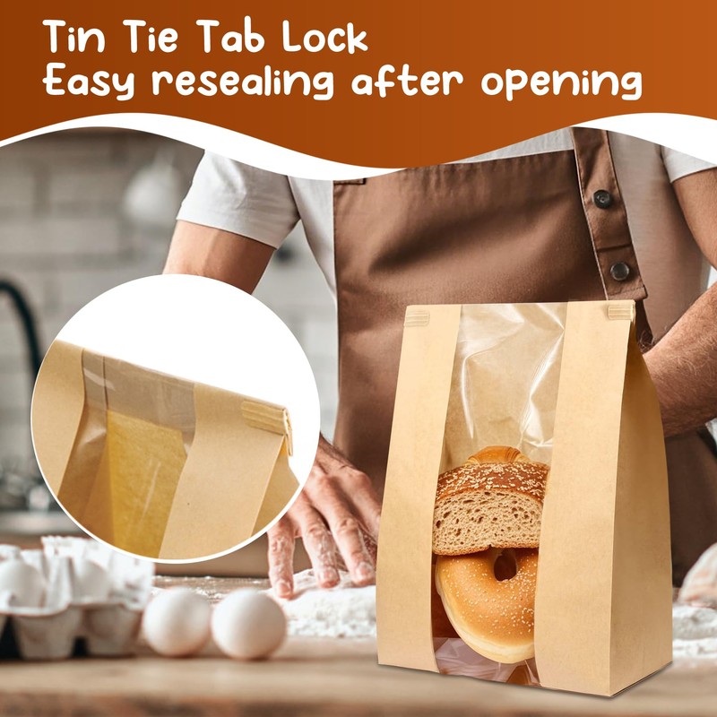 Elevate your packaging with our premium kraft paper bread bags with clear window and tin tie closure—perfect for both presentation and practicality. Made from thick, tear-resistant kraft paper, each bag includes a food-grade PE liningthat provides excellent water, oil, and leak resistance, helping keep your baked goods fresh, clean, and well-protected.