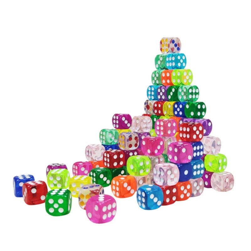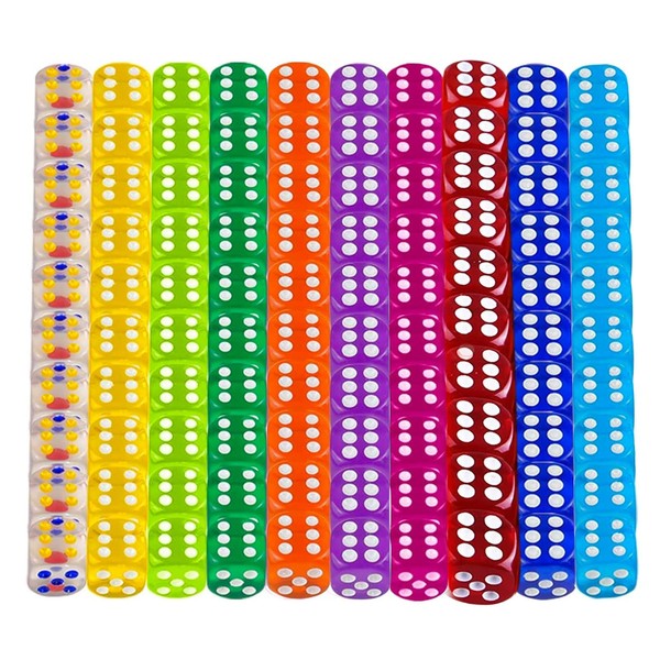 • 【100-piece dice set】Consists of 100 6-sided dice in 10 colours, 10 pieces of each colour. Standard 12 mm rounded cubes.