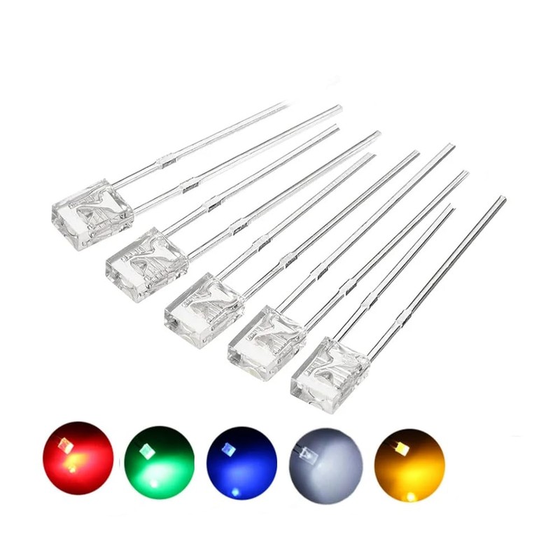 100 Pieces 2 x 5 x 7 mm Transparent Square 5 Colours LED Light-Emitting Diode White Yellow Red Green Blue Electronic for Science Projects, Schools and DIY Projects